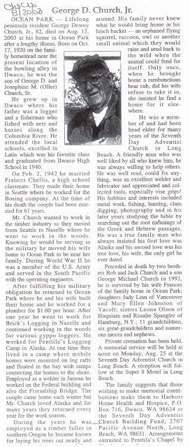 They lived most of their married life in Ilwaco, Pacific, Washington. William died 6 May 1932 in Ilwaco. He was buried in Ilwaco Cemetery but he has no stone. Martha moved to Oak Harbor with her daughter Elizabeth Estella Powell. Martha died 15 Mar 1937 in Oak Harbor, Island County, Washington. She is buried Maple Leaf Cemetery.